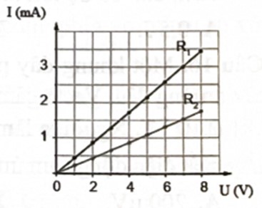 Câu 10: Đường đặc trưng vôn ampe của hai điện trở R1 và R2 được cho như hình vẽ. Tỉ số \(\frac{{{{\rm{R}}_2}}}{{{{\rm{R}}_1}}}\)bằng