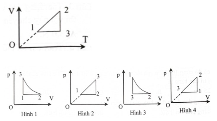 Câu 11: Hình bên là đồ thị mô tả sự biến đổi trạng thái của 1 mol khí lí tưởng trong hệ toạ độ V – T. Đồ thị của sự biến đổi trạng thái trên trong hệ toạ độ p − V tương ứng với hình nào sau đây?